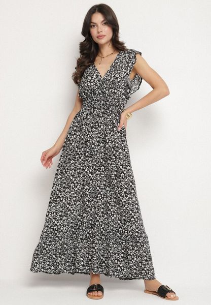 Czarna Sukienka o Rozkloszowanym Kroju z Falbankami w Kwiatowy Wzór Aravisse