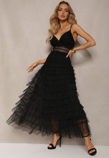 Czarna Sukienka z Koronką na Regulowanych Ramiączkach z Falbankami Joellama