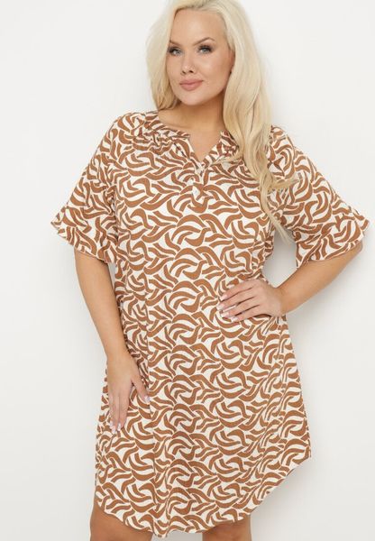 Ciemnobeżowa Sukienka z Wiskozy o Pudełkowym Kroju z Abstrakcyjnym Wzorem Koririanne