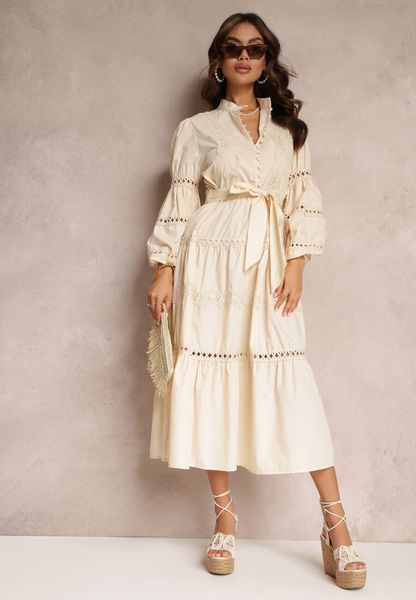 Beżowa Koszulowa Rozkloszowana Sukienka Midi z Paskiem i Ozdobną Koronką oraz Guzikami Casuva