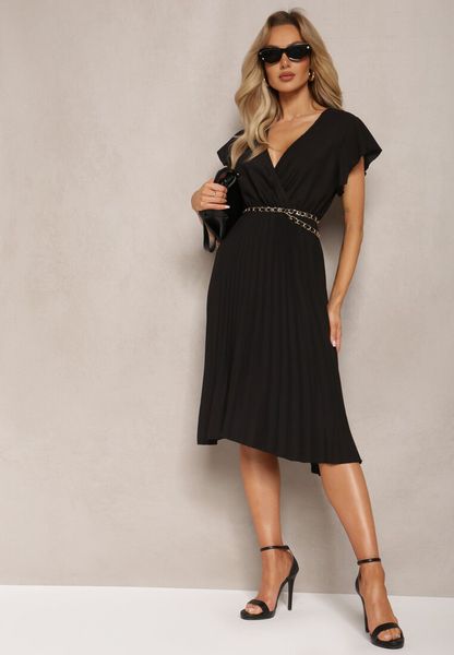 Czarna Midi Sukienka o Rozkloszowanym Fasonie z Kopertowym Dekoltem i Plisami Axanntia