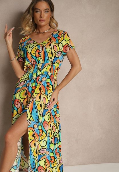Sukienka z Bawełny w Abstrakcyjny Wzór Emisienna to prawdziwy must-have dla każdej modowej entuzjastki! Jej luźny fason z guzikami przy dekolcie z gumką w talii z okrągłym dekoltem podkreśla kobiecość. Abstrakcyjny wzór dodaje artystycznego sznytu. Stylizuj ją z sandałami na obcasie i delikatną biżuterią, z łatwością stworzysz elegancki look, gotowy na letnią imprezę w ogrodzie!
