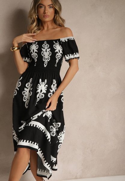 Czarna Sukienka Hiszpanka Ozdobiona Etnicznym Printem Aralette