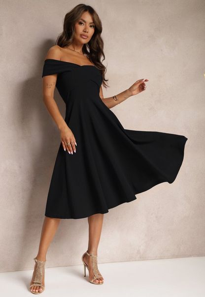 Czarna Sukienka z Hiszpańskim Dekoltem o Rozkloszowanym Kroju Pelorea