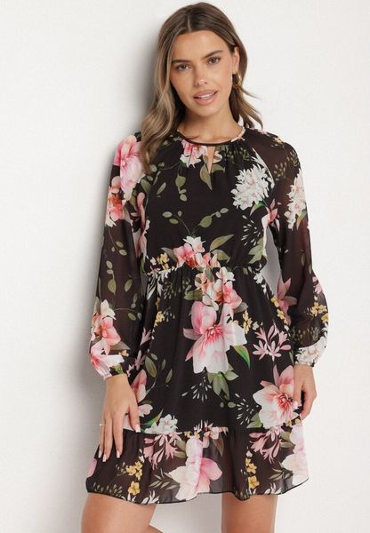 Czarna Sukienka o Rozkloszowanym Kroju w Kwiaty Zeramera