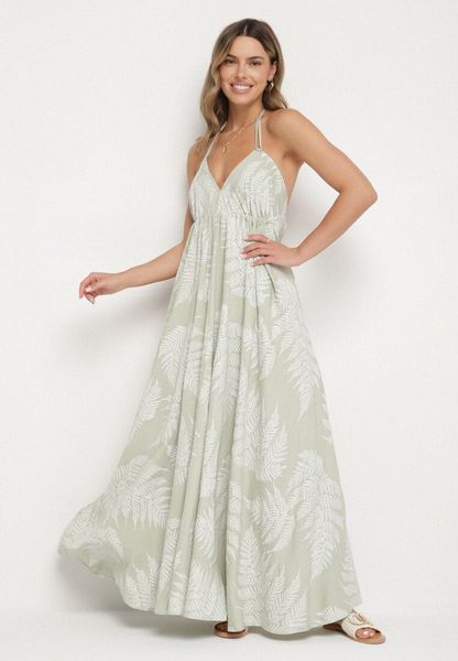 Zielona Wiskozowa Sukienka w Etniczny Wzór o Rozkloszowanym Kroju z Wiązaniem Nalpio