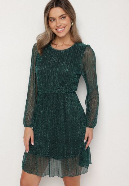 Ciemnozielona Sukienka z Wiskozy Ozdobiona Metaliczną Nicią Meliorea