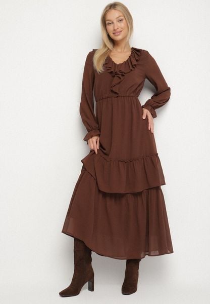 Brązowa Siateczkowa Sukienka VICES o Rozkloszowanym Kroju z Falbanami Arevite