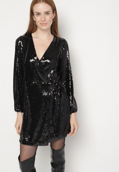 Czarna Cekinowa Sukienka o Kopertowym Kroju z Wiązaniem w Talii Eprelle