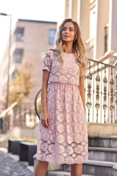 Sukienka na wesele koronkowa lekko rozkloszowana pudrowy róż