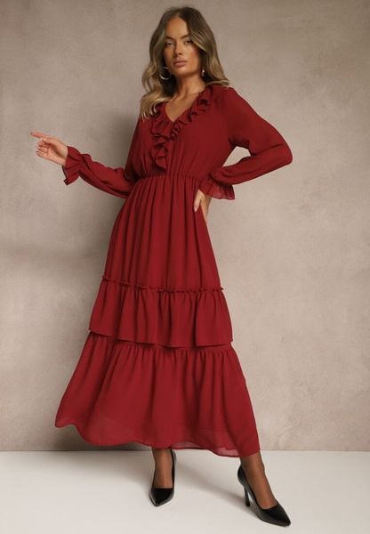 Bordowa Rozkloszowana Sukienka VICES z Falbanami i Transparentnymi Rękawami Aruvite
