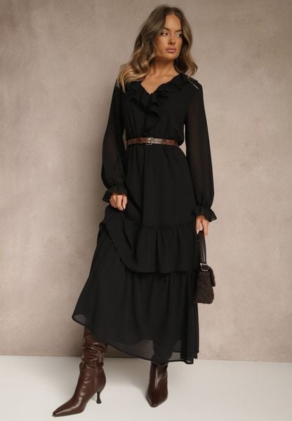 Czarna Rozkloszowana Sukienka VICES z Falbanami i Transparentnymi Rękawami Aruvite