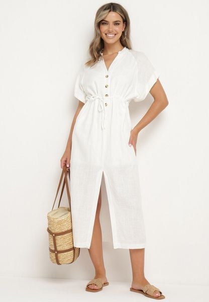 Biała Bawełniana Sukienka z Koszulową Górą i Ściągaczem w Talii Vikleta