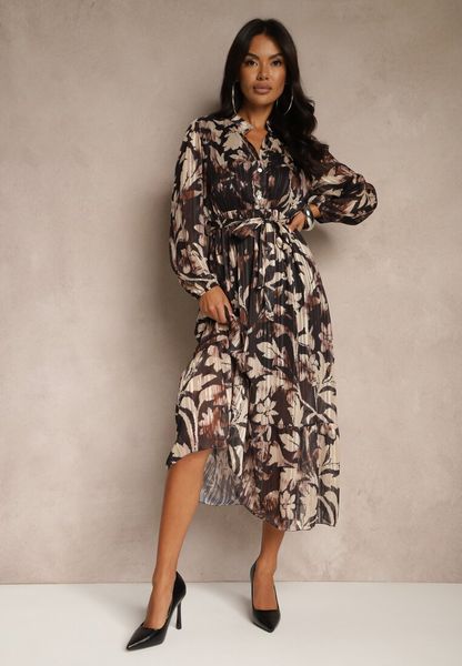 Brązowa Sukienka o Rozkloszowanym Kroju z Wiązanym Paskiem i Metaliczną Nicią Nalimirae