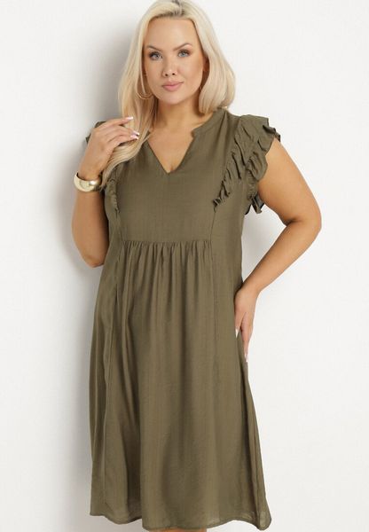 Ciemnozielona Sukienka Pudełkowa z Bawełną i Trójkątnym Dekoltem Ozdobiona Falbankami Vikirva