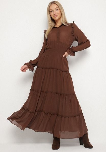 Brązowa Rozkloszowana Sukienka VICES Koszulowa w Stylu Retro Aravite
