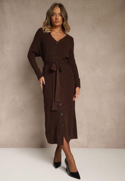 Brązowa Prążkowana Sukienka Dzianinowa z Domieszką Wełny Zapinana na Guziki Nalemma