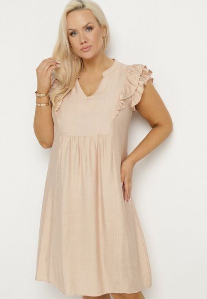 Beżowa Sukienka Pudełkowa z Bawełną i Trójkątnym Dekoltem Ozdobiona Falbankami Vikirva