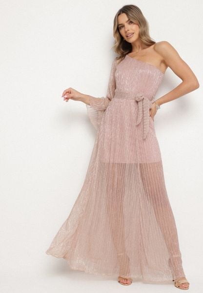 Różowa Sukienka o Asymetrycznym Kroju Zdobiona Metaliczną Nicią Afellia