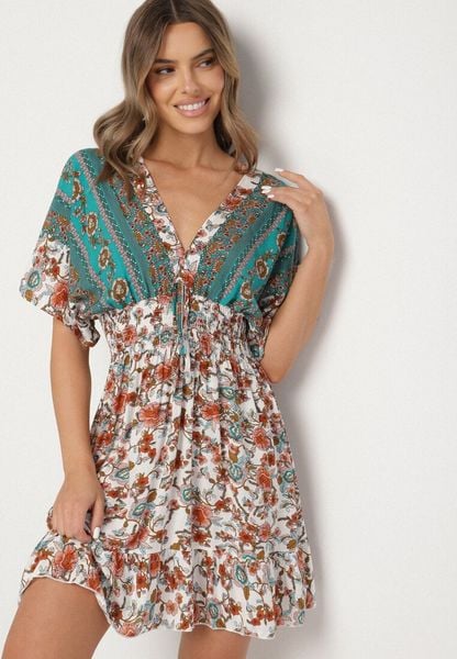 Zielona Sukienka a Kwiatowa Sukienka Zdobiona Wiązaniem z Tyłu i Gumką w Pasie Rivattia