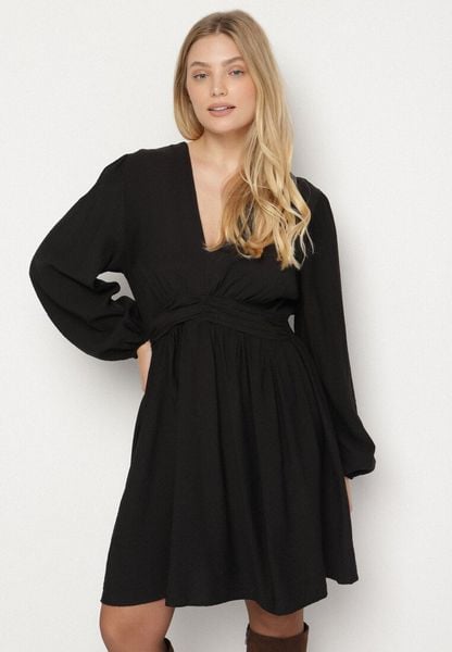 Czarna Rozkloszowana Sukienka z Marszczeniem w Talii i Dekoltem w Serek Salindea