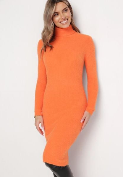 Pomarańczowa Sweterkowa Puchata Sukienka Midi z Wełny z Golfem Sebhat