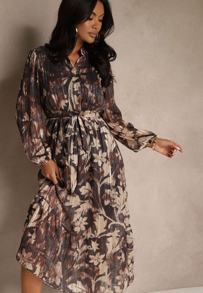 Szara Sukienka o Rozkloszowanym Kroju z Wiązanym Paskiem i Metaliczną Nicią Nalimirae