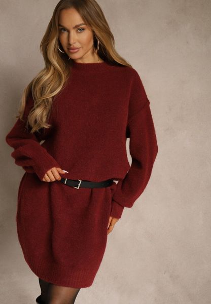 Bordowa Dzianinowa Sukienka z Dodatkiem Wełny o Pudełkowym Kroju Nesava
