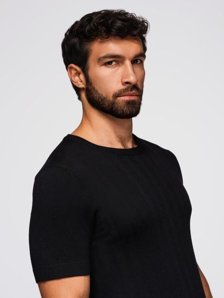Ażurowy męski sweter z okrągłym dekoltem i krótkim rękawem – czarny V2 – Rozmiar: XXL