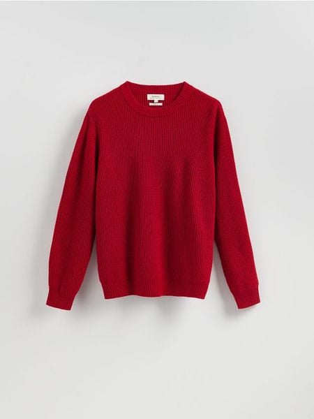 Sweter o luźnym kroju, wykonany z dzianiny z wełną.
