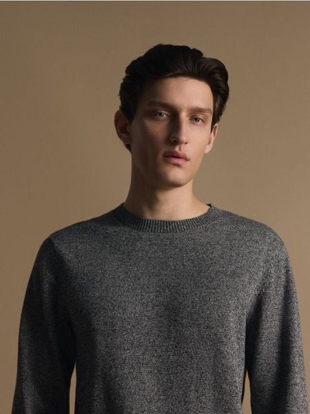 Sweter o prostym kroju, wykonany z melanżowej dzianiny.