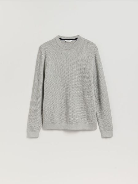 Sweter o prostym fasonie, wykonany ze strukturalnej, bawełnianej dzianiny.