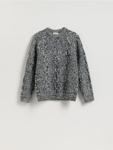Sweter o regularnym kroju, wykonany z wełnianej dzianiny.