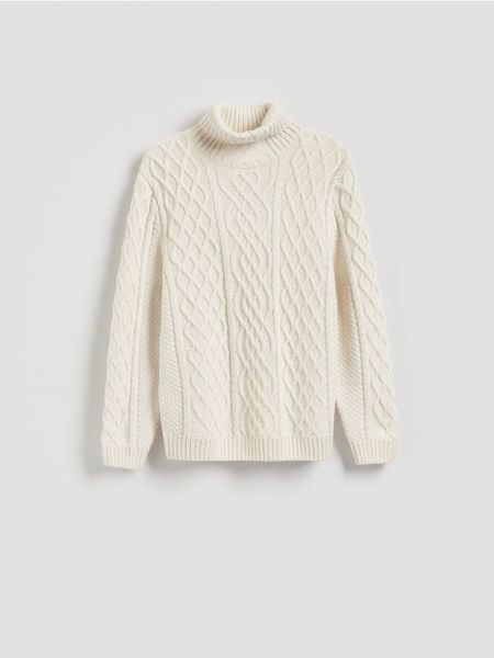 Sweter o prostym kroju, wykonany z dzianiny z bawełną.