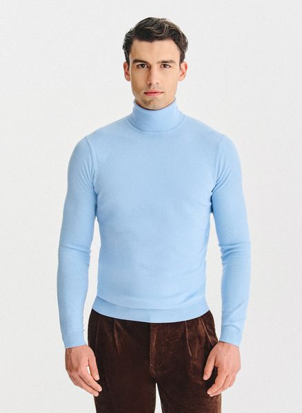 Jasnoniebieski golf męski – Pako Lorente. Jasny jesienny sweter męski. Golf o prostym fasonie. Skład: 78% bawełna, 19% poliamid, 3% elastan. Basic.