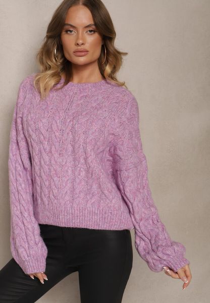 Fioletowy Sweter z Domieszką Wełny o Prostym Kroju Zdobiony Splotem w Warkocz Durira