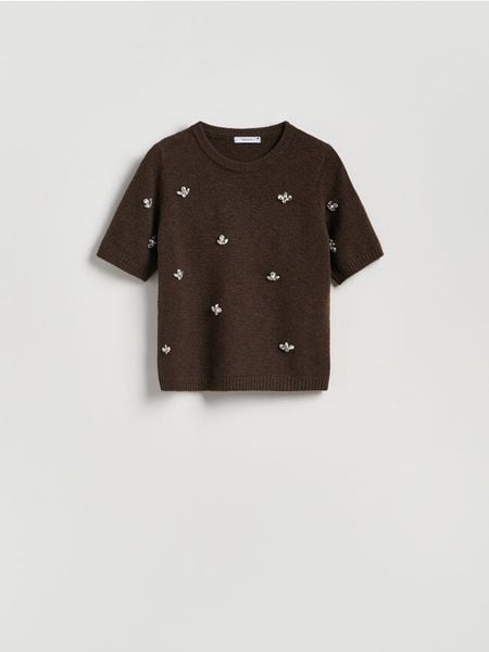 Sweter o prostym fasonie, wykonany z dzianiny z domieszką wełny.