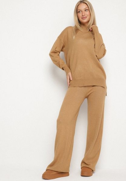 Ciemnobeżowy Dzianinowy Komplet z Wełną Sweter z Półgolfem i Szerokie Spodnie Lanerra