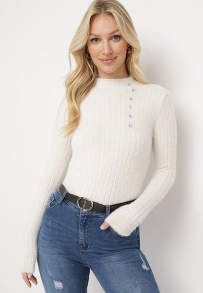 Jasnobeżowy Puchaty Wełniany Sweter z Półgolfem i Biżuteryjnymi Guzikami Xeminta