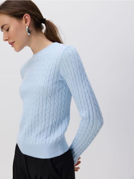 Sweter o prostym kroju, wykonany z dzianiny z dodatkiem wiskozy.