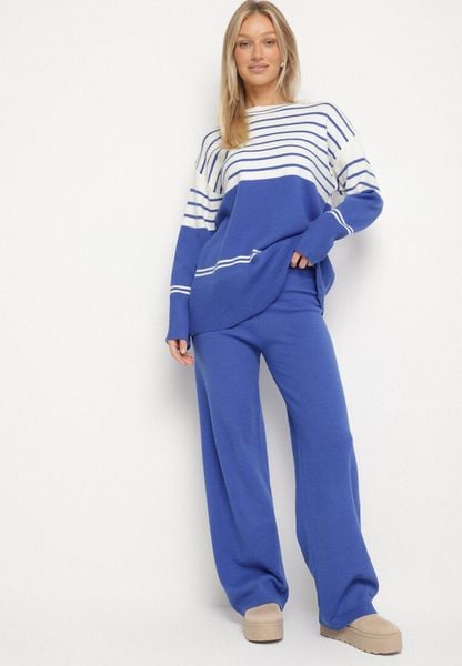 Niebieski Dzianinowy Komplet z Wełną Sweter w Paski i Spodnie Raleina