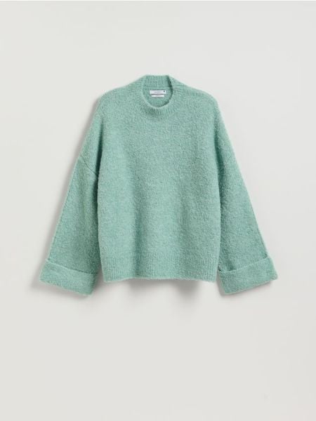 Sweter o swobodnym fasonie, wykonany z dzianiny z dodatkiem wełny.