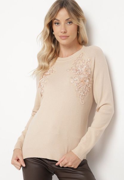 Ciemnobeżowy Sweter z Siateczkowymi Wstawkami z Cekinami Perełkami i Koralikami Evoriana