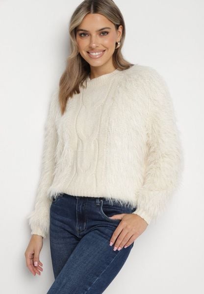 Jasnobeżowy Sweter z Długim Włosiem i Dodatkiem Wełny Merithina