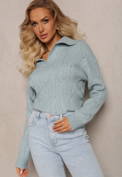 Miętowy Sweter z Dekoltem w Serek i Ozdobnym Splotem Travissa