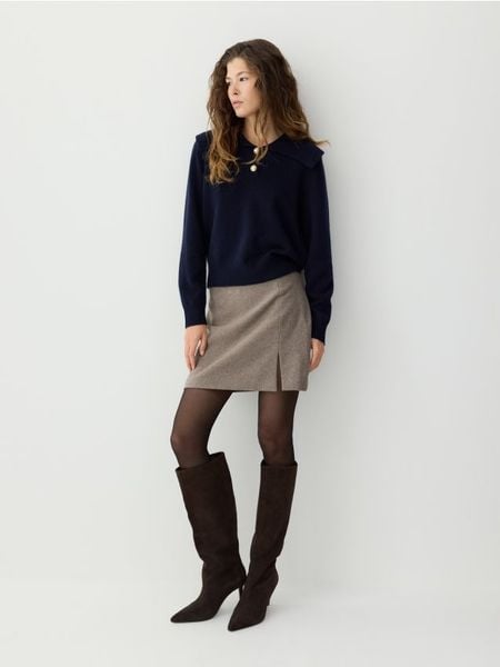Sweter o prostym kroju, wykonany z wełnianej dzianiny z dodatkiem kaszmiru.