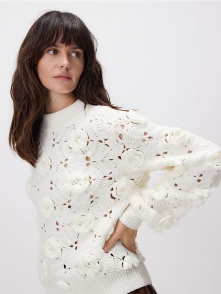 Sweter o swobodnym kroju, wykonany z ażurowej dzianiny.