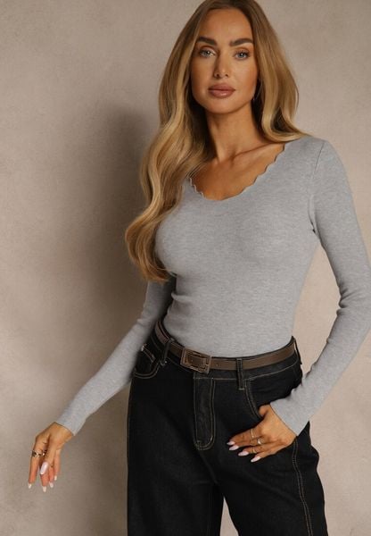 Szary Dopasowany Sweter z Nieregularnym Dekoltem w Serek Fenarela