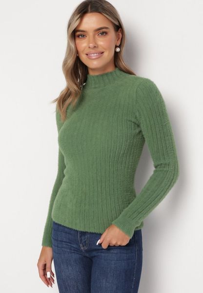 Zielony Wełniany Sweter Prążkowany z Długim Włosiem Aryndra