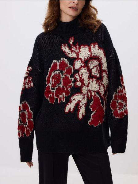 Sweter o kroju oversize, wykonany z dzianiny z wełną.